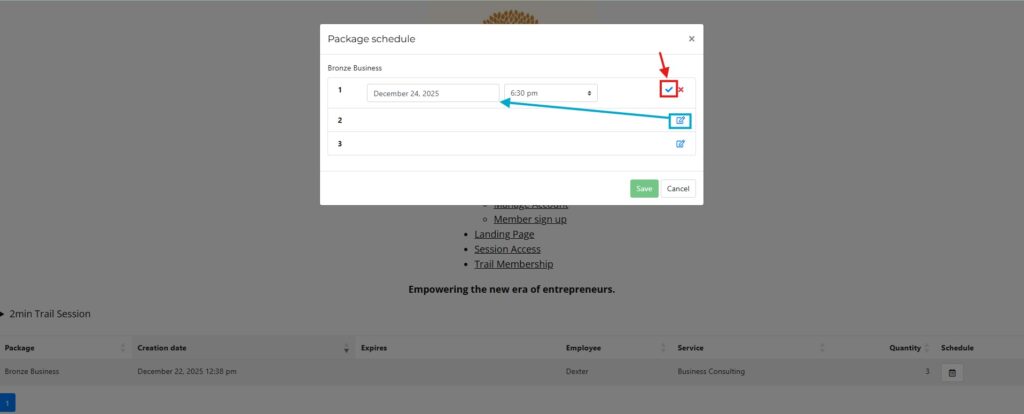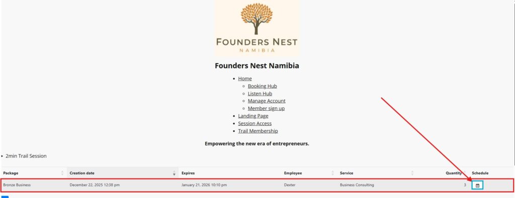 Once your account has been created and payment been linked, you will see the package you have subscribed to in the list. Click on the calendar icon to open the booking screen to select the day and time you would like to have the online session.